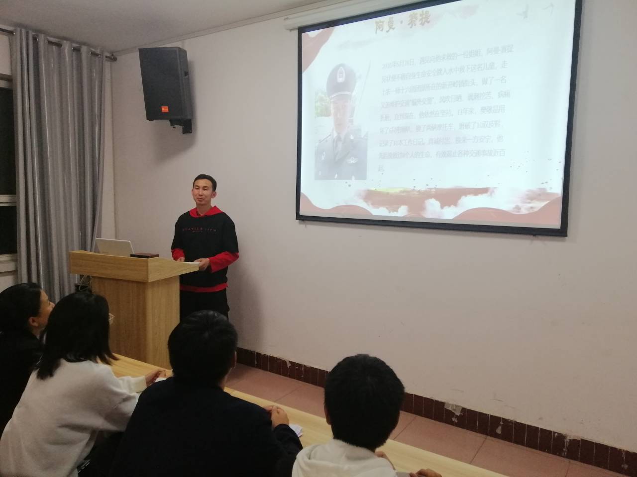 民语言20-2员工何睦说,自己今天收获了很大,身边的先进事迹将激励我要从小事做起,为同学多做服务,贡献自己的力量。