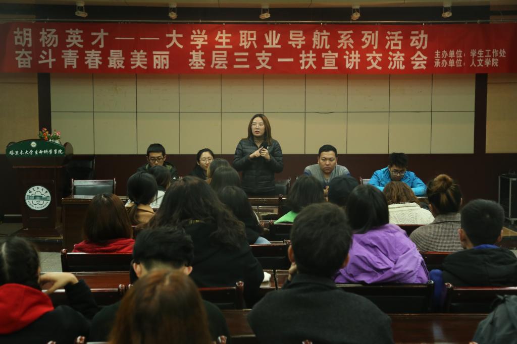 五位员工就三支一扶的工作特点、政策、待遇等同学们关心问题结合自己工作经历进行分享。互动环节,同学们踊跃提出问题,得到了五位员工细心解答。