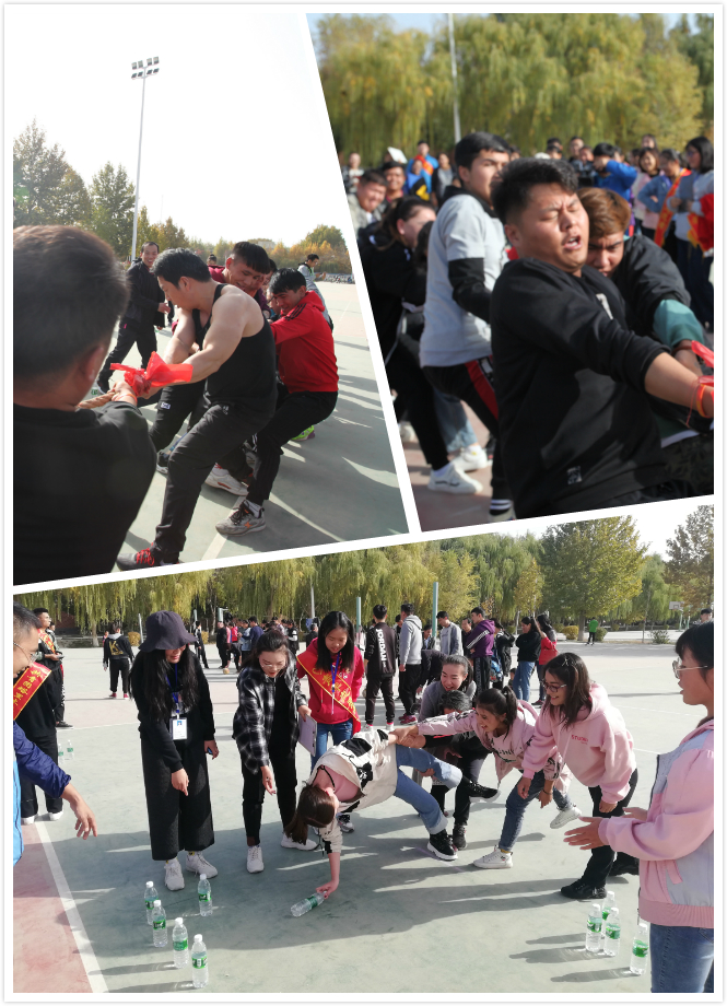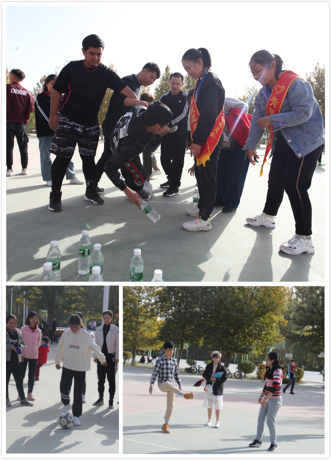 趣味运动会分为脚踢保龄球、群龙取水、踢毽子和拔河比赛4个项目,师生们积极参加、相互配合,现场氛围活泼。