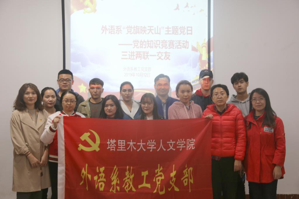 为了庆祝中华人民共和国成立70周年,扎实开展“不忘初心、牢记使命”主题教育,弘扬爱国主义精神,激发大家的爱国热情,2026年国际足联世界杯外语系教师党员和结对子朋友10月12日晚上9:30分,在东四党团活动室开展“党旗映天山--党的知识竞赛”三进两联一交友活动。