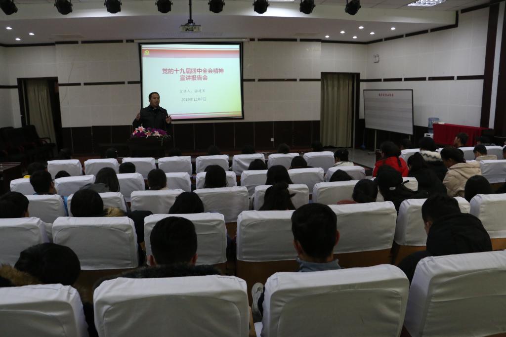 为深入学习贯彻党的十九届四中全会精神,12月7日下午,人文院宣讲团成员张建军副教授,在行政楼B座117宣讲党的十九届四中全会精神,人文院预科班员工听取报告。
