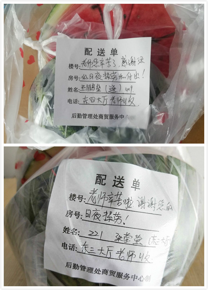 4月28日下午,东区3号、4号员工公寓楼里的值班老师都收到这样一个西瓜,配送单写道:“老师您辛苦了,感谢您的日夜操劳和付出”。顿时让收到西瓜的老师感动满满,眼眶中闪烁着泪光。