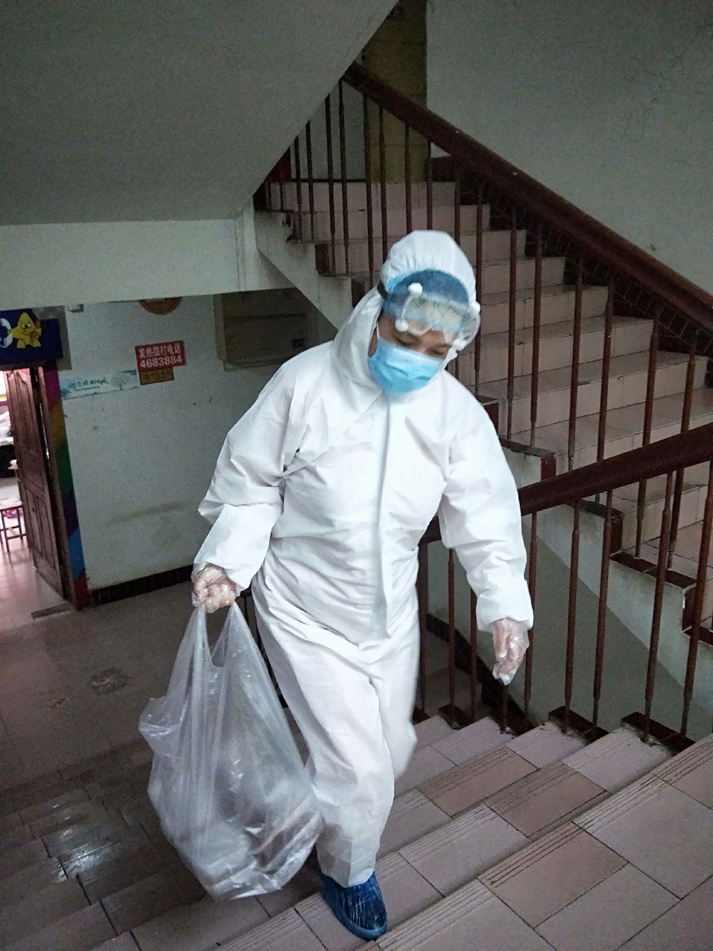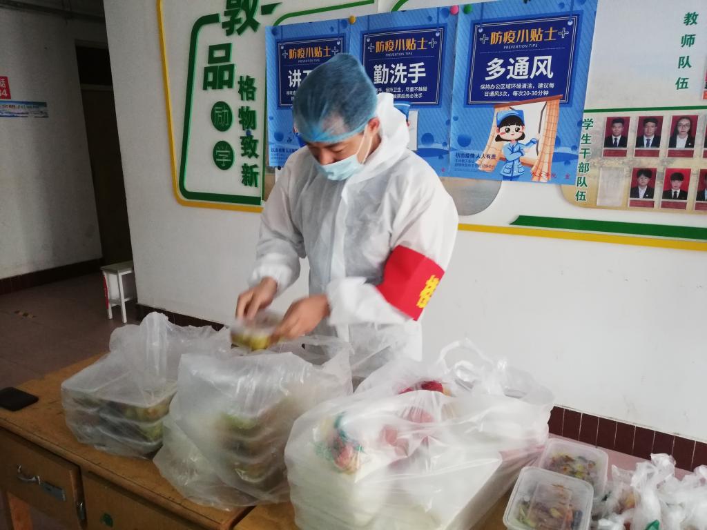 为了服务好员工,让员工吃上热乎的饭菜,他每天从1楼大厅清点好餐食份数,把饭菜送到员工宿舍门口。每天在QQ群里及时提醒员工们要测量体温、宿舍要勤通风、保持卫生、垃圾分类。员工“网购”的物品,他不厌其烦的一趟趟送往楼上。