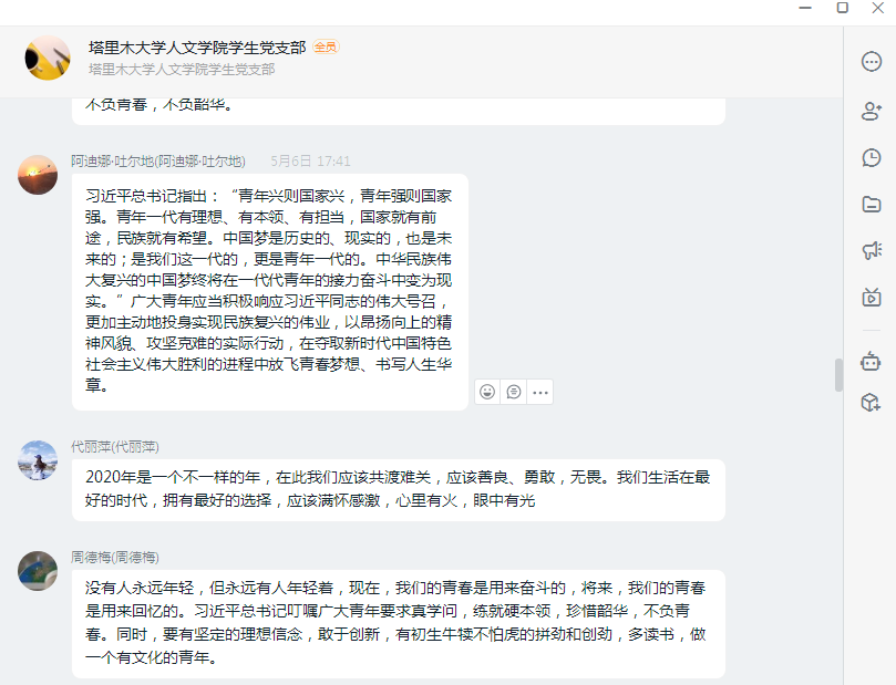 党支部成员纷纷表示,要发扬和继承五四精神,坚定理想信念,站稳人民立场,练就过硬本领,投身强国伟业和维稳戍边事业,为南疆发展贡献自己的青春力量。