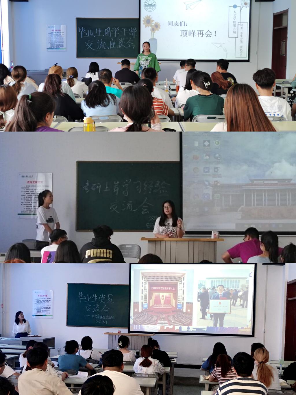 6月9日-6月16日开展毕业生党员、团学干部、优秀毕业生、考研上岸经验交流会共4场。优秀毕业生将自己的事迹和学习、就业、考研及个人发展的经验分享给同学们,激励学弟学妹们刻苦学习、成长成才。