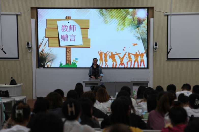 中文系教师王海蓉教授、胡昌平教授、中文系党总支书记屈玉丽也代表中文系教师做了教师赠言。王海蓉把毕业比作一场逃离,但也是一段人生旅程的新起点,每个员工都能在未来的画布上描画更美好的未来。胡昌平希望员工做一个身心健康的人、快乐的人、有爱心的人;能够树立和坚持学习的意识(特别是终身学习的意识)、忧患意识和担当意识。屈玉丽回忆同学们朝夕相处的点点滴滴,在感慨中饱含着对同学们的不舍与感动,也勉励每位同学要都心怀感恩,感恩社会、感恩父母、感恩老师、感恩同学,只有心怀感恩,美好才能不期而遇,希望同学们身心健康、保持好学之心、乐观面对生活,以实际行动诠释担当和奉献。