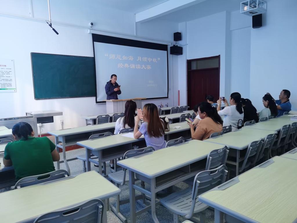 当团圆遇上感恩,一篇篇如歌如画的经典美文,在教师们或激昂或深情的诵读中,被演绎得淋漓尽致、精彩纷呈。“春江潮水连海平,海上明月共潮生”这动人的良辰美景,构成了一幅诱人探寻的奇妙艺术境界。“这是一份铺洒阳光的事业,这是一句无法背弃的誓言”,教师身负一种使命,也代表着一份责任。