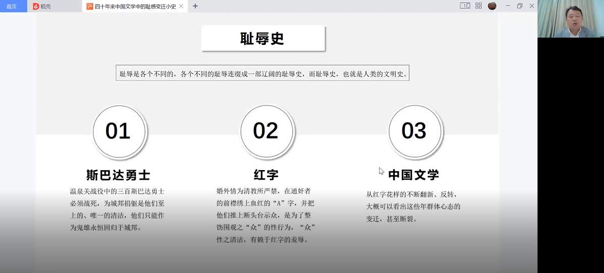 翟业军教授从耻感的神话来源讲起,指出耻感的觉醒是人类文明的叙述起点,也是一切文学叙述的驱动力。他从中国当代文学路遥的《平凡的世界》《人生》、铁凝的《啊!香雪》《谁能让我害羞》、余华的《第七天》、方方的《涂自强的个人悲伤》、许春樵的《屋顶上空的爱情》、张猛的《钢的琴》、双雪涛的《平原上的摩西》,到王安忆的《长恨歌》,他通过一部部精微的文本解剖,为听众清晰地呈现了耻感在小说中的脉络和走向。他还援引斯巴达勇士、《红字》《红与黑》等,指出耻辱是各不相同的,各个不同的耻辱连缀成一部辽阔的耻辱史,而耻辱史,也就是人类的文明史。