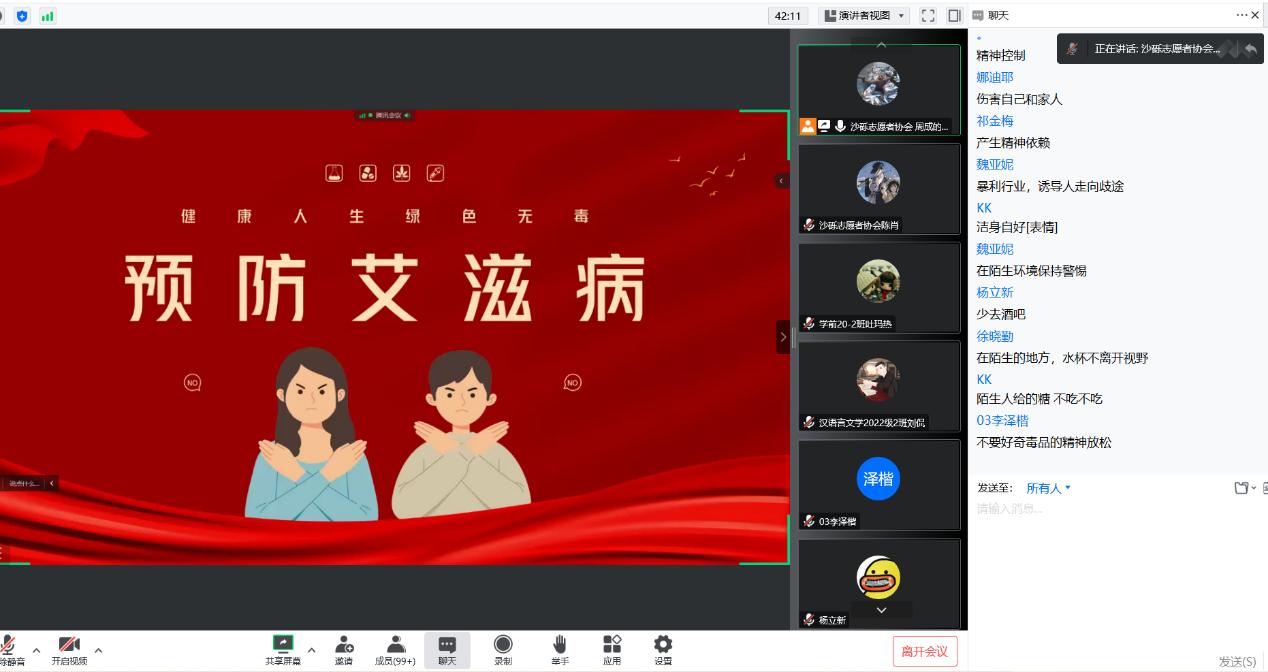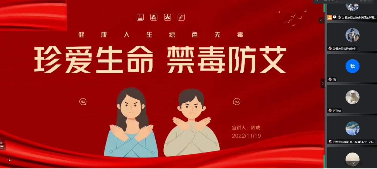 在活动中,沙砾志愿者协会副会长周成作了艾滋病基本知识及防治方面的宣讲,解答了关于“什么是艾滋病、艾滋病的危害、艾滋病怎样传播以及如何防治艾滋病”等问题,并勉励老员工们建立正确的择偶观、人生观,努力做好个⼈艾滋病预防,积极参与全社会艾滋病防治。宣讲中,同学们共同进行了“预防艾滋”知识竞答,达到了良好的艾滋病防治知识宣传效果。