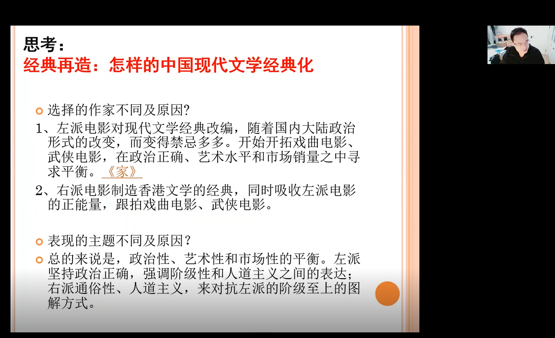 金进研究员首先指出冷战是20世纪全球历史上一个重要的事件,冷战对华语电影史、华语文学影响巨大。他将南来影人的南迁及其在香港的创作放在冷战的背景下讨论,一方面讨论南来影人这一群体因文化身份、国族观念等而导致香港电影的微妙变化,分析了1950—70年代香港电影和台湾电影对大陆电影的历史传承。另一方面,文化冷战直接促使南来影人在政治立场的分化,这种意识形态的分野也影响了中国现代文学的经典化。因意识形态的对立和电影市场的需要,左派影人改编并拍摄以鲁迅、茅盾、巴金、曹禺为代表的五四新文学大师的经典之作,为中国现代文学经典化做出了巨大的贡献。右派影人则选择沈从文、徐訏、张爱玲以及大量香港本土作家的作品,多制作无明显政治倾向的商业片,歌舞、青春、浪漫色彩浓厚。
