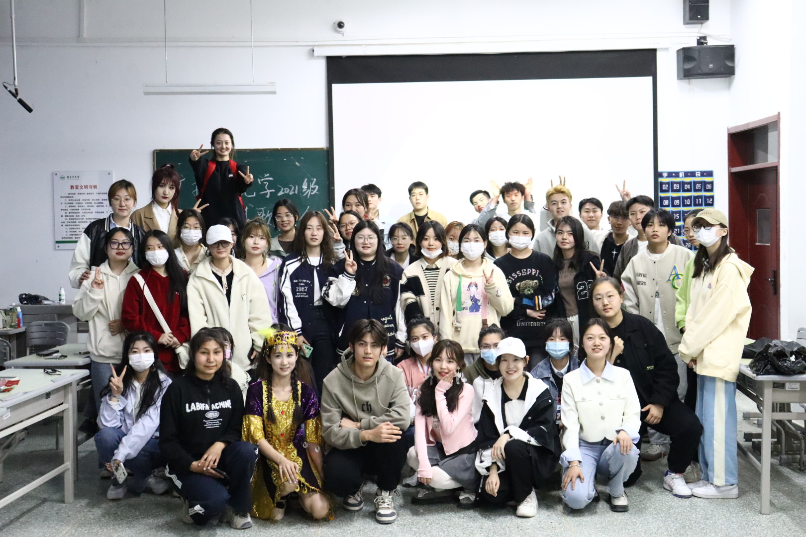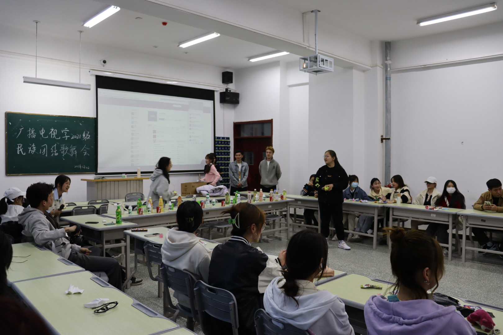 为加强同学之间互助友谊,增进各民族同学间的情感交流,3月31日晚广播电视学2021级1班与2班全体成员共同举行了民族团结歌舞会。歌舞会以游戏作为开场,通过游戏同学们的热情高涨,也让整场活动的氛围欢快了起来。