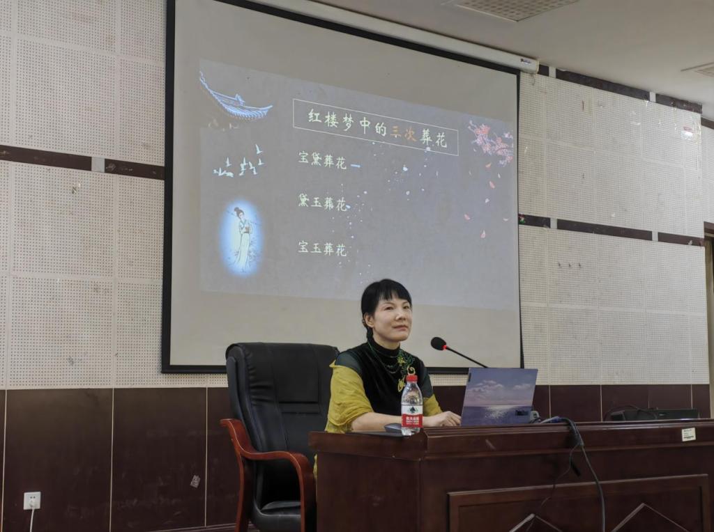 课堂上,杨教授从“黛玉葬花”这一经典片段切入,并从黛玉的现实境况、情感映射、性格写照以及最后的悲惨命运等几个角度向同学们深入分析了其中的寓意内涵。