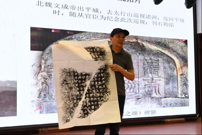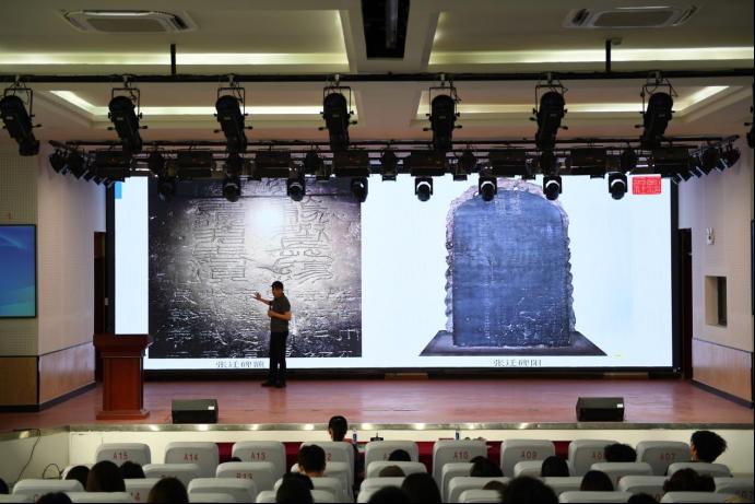 在近一小时的精彩分享中,韩治平经理以“汉碑拓片”为主题,从西域克孜尔到长安碑林的石刻艺术发展脉络,从分类到特点,特别对克孜尔石窟的菱格构图、碑林名碑的传拓技艺等专业内容进行了深入浅出的解读,配合现场展示的拓片实物,让在场师生真切感受到碑拓艺术的魅力。