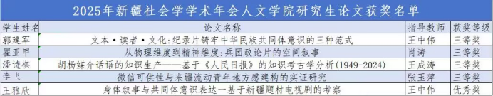 6月15日,2025年度新疆社会学学会学术年会在石河子大学举办。新闻与传播专业硕士研究生郭建军、翟亚甲、李飞、王雅欣、潘诗棋的学术论文入选年会研究生优秀论文,他们的论文获四项三等奖,一项优秀奖。