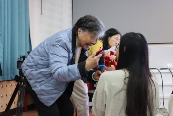 主持人包朗教授介绍了吴洁敏教授的教学与科研成果。随后,吴教授从教学实践经历讲起,分享了其对朗诵教学的体会。她指出:“想象力比知识更重要,因为知识是有限的,而想象力概括着世界上的一切,推动着进步,并且是知识进化的源泉。”现场师生深受启发,掌声热烈。