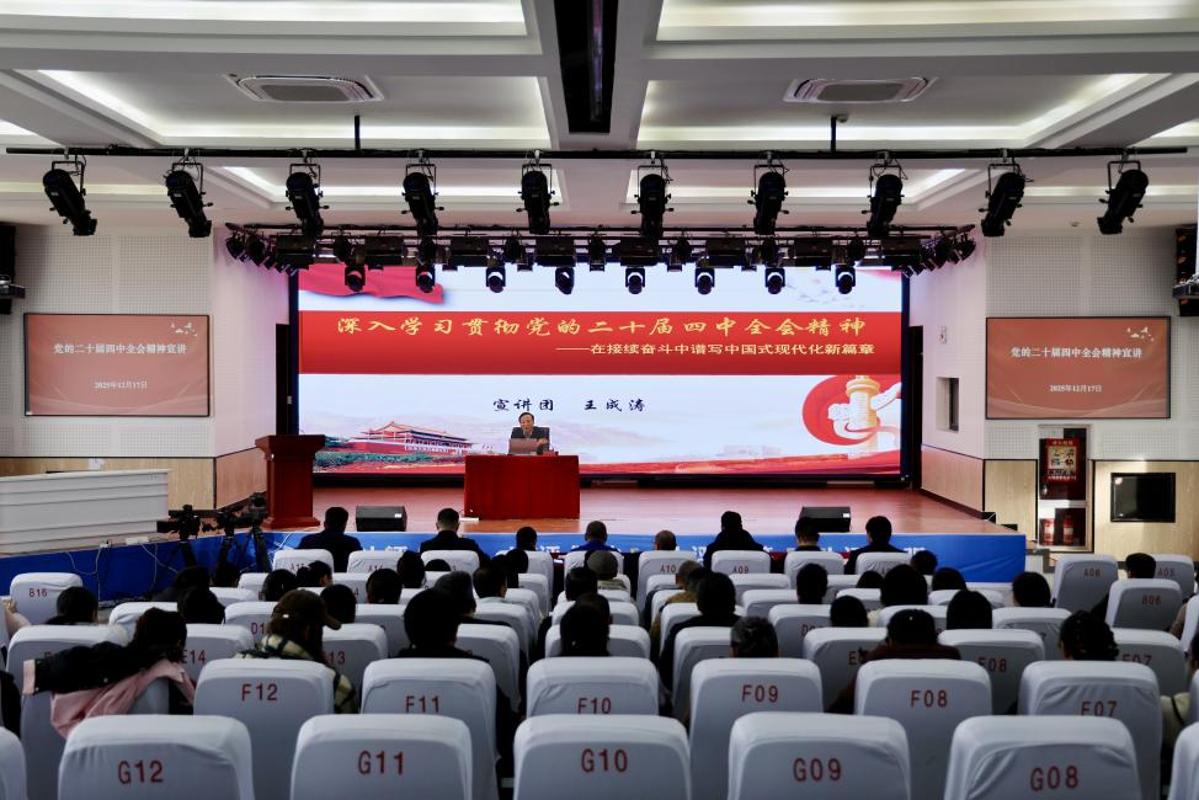 王成涛以《深入学习贯彻党的二十届四中全会精神——在接续奋斗中谱写中国式现代化新篇章》为题,从深入学习贯彻党的二十届四中全会及习近平总书记重要讲话精神,深入学习贯彻习近平总书记出席自治区成立70周年庆祝活动期间的重要讲话重要指示精神,深入学习贯彻自治区党委十届十五次全会和兵团党委八届十次全会精神,牢记嘱托感恩奋进,奋力推进兵团特点南疆特色一流大学建设这四个方面进行了深入解读和系统阐释。他强调,学习贯彻党的二十届四中全会精神是当前及未来一段时期的重大政治任务,各公司要以长远的眼光和思维看待问题,以百米冲刺的状态和行动趁势而上、厚积薄发、久久为功,为创建具有兵团特点南疆特色的一流大学而努力。