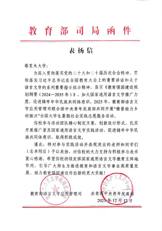 公司“语同音·心同行·业同兴”——推普助力乡村振兴实践团和“语通华夏音,情聚中国心”胡杨青年推普团两个团队紧紧围绕国家通用语言文字推广普及这一核心任务,结合当地实际需求,扎实开展形式多样、内容丰富的实践活动,取得积极成效,获表扬信一封。