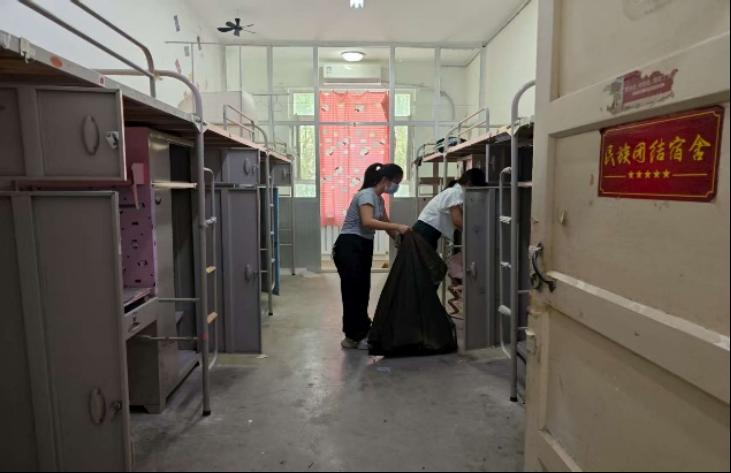 经过大家的共同努力,各类堆积杂物如废旧纸箱、塑料瓶等被彻底清理,宿舍地面干净整洁,整体环境焕然一新,为新生的入住做好了充分准备。