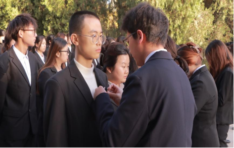 团委员工兼职副书记音克拉·切登巴勒主持本次入团仪式,首先宣布入团仪式正式开始,全体师生在王震将军像前奏唱国歌,仪式整体庄严肃穆,在阳光的照耀下显得熠熠生辉。接下来,由团委挂职副书记武昱彤老师宣读新团员名单,按照传统由老团员向新团员佩戴团徽。团徽佩戴整齐后,新团员进行入团宣誓,誓言铿锵有力,令人振奋。接着新团员游靓、老团员李诗宇代表发言,最后党员代表武昱彤对新团员提出三点希望和要求:一是努力学习,勇攀高峰;二是发挥共青团的模范带头作用;三是自觉学习党团理论知识,成为有理想有道德的新时代接班人。