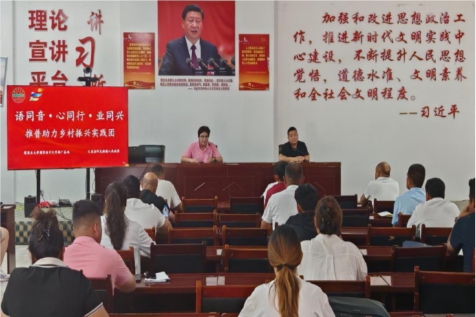 为深入贯彻落实党的二十大和二十届二中、三中全会精神,贯彻落实习近平总书记在全国教育大会上的重要讲话精神。7月3日下午,“语同音·心同行·业同兴——推普助力乡村振兴实践团”在喀什地区巴楚县阿瓦提镇举行了隆重的开班仪式。阿瓦提镇曾桐涛书记出席会议,对实践团的到来表示了热烈欢迎。