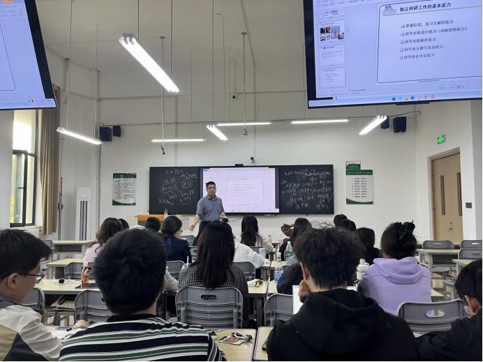 座谈伊始,他以“何谓科学研究”为题与学子们进行深入讨论,强调研究生需从“知识接受者”转向“知识创造者”,指出除扎实专业知识外,更要培养创新思维、实验操作、论文撰写发表及基金申请能力,鼓励学子们“厚积薄发,广读精读”,通过阅读经典与前沿文献构建知识体系并逐步将自身培养为一名优秀的研究生。