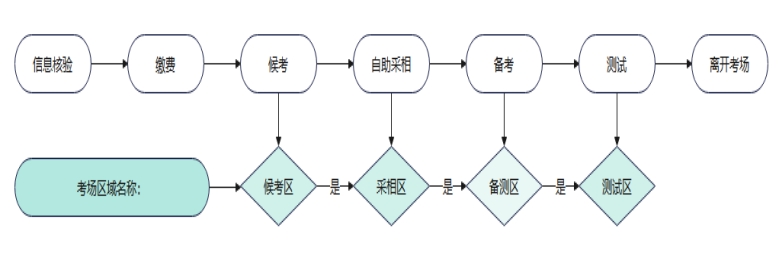 八、测试流程:(信息核验-缴费-候考区候考-采相区自助采相-备考区备考-测试区测试-离开考区)