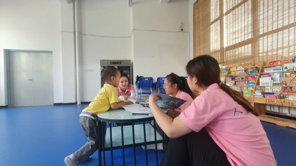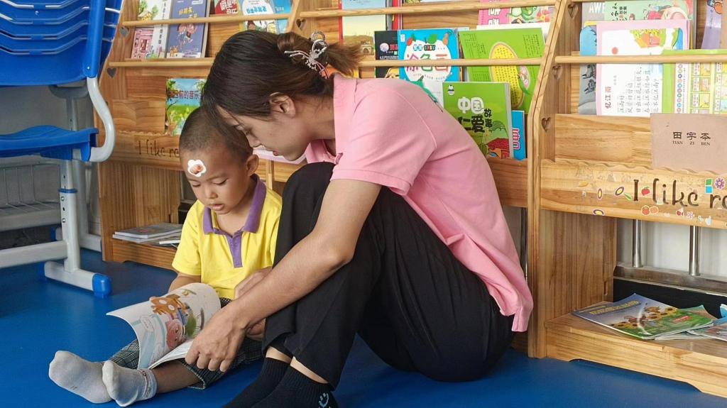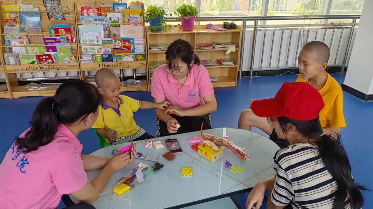 志愿者们到达福利院有序地开展教育关怀助学活动。在课堂中,志愿者们协助育婴师开展绘画、阅读、手工制作和户外活动等。志愿者与孩子们席地而坐,手把手地带领他们绘画创作,一起阅读绘本并分享故事情节,教授孩子们如何识别绘本中的文字,利用彩泥、扭扭棒、纸张等材料进行工制作活动。而后,一起在教学楼外进行了很多有趣的户外活动。