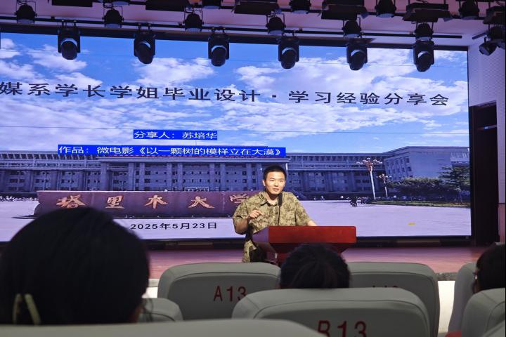 苏培华在讲述微电影《以一棵树的模样立在大漠》的创作过程中,提及了遇到的种种挑战:突降大雪、车辆故障、设备受限等,但他依然坚持不懈,最终完成了这部作品。“所有意外都是必修课。”苏培华向与会同学展示被风沙磨损的摄像机时建议大家,“提前做好分镜脚本和应急预案,才能把意外变成故事的一部分”。